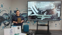 Видеоматериалы, подготовленные библиотекарем Ю.Н. Золотаревой, рассказали о жизненном пути композитора, его переезде в Казахстан в 1933 году и первых шагах на казахской земле. Особое внимание было уделено созданию им первых казахских опер, «Кыз-Жибек», «Жалбыр», «Ер Таргын», в которых он сумел соединить народные мелодии, эпические сюжеты и классические музыкальные формы. Эти произведения стали основой национального оперного искусства и открыли новую страницу в культурной жизни республики. Ребята познакомились с интересными фактами: именно Брусиловский впервые использовал казахские народные мелодии в симфонических и оперных произведениях, а его партитуры стали основой для дальнейшего развития национальной композиторской школы. Видеоряд сопровождался звучанием фрагментов его известных произведений, что помогло передать атмосферу эпохи и богатство музыкальных образов.